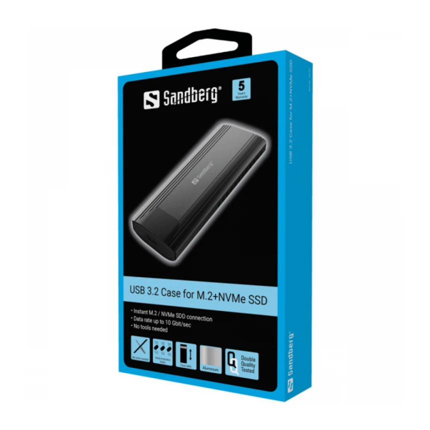 Sandberg USB 3.2 kućište vam omogućava da lako povežete M.2 ili NVMe SSD eksterni disk. Jednostavno otvorite praktično aluminijumsko kućište pritiskom na dugme. Zatim umetnite disk u ležište i utisnite ga bez potrebe da koristite zavrtnje. Kućište se povezuje putem USB-C ili tradicionalnog USB-A. Sadrži USB 3.2 interfejs za munjevitu brzinu prenosa do 10 Gbps.